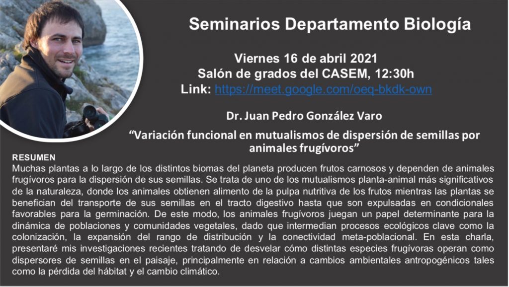 Este viernes 16 de abril celebraremos una nueva charla-seminario. Nos acompañará Juan Pedro González Varo, investigador del programa Ramón y Cajal que está adscrito al Área de Botánica. Juanpe nos va a hablar sobre interacciones entre plantas y animales frugívoros como medio de dispersión de semillas. Os esperamos en el aula o en el enlace proporcionado.
